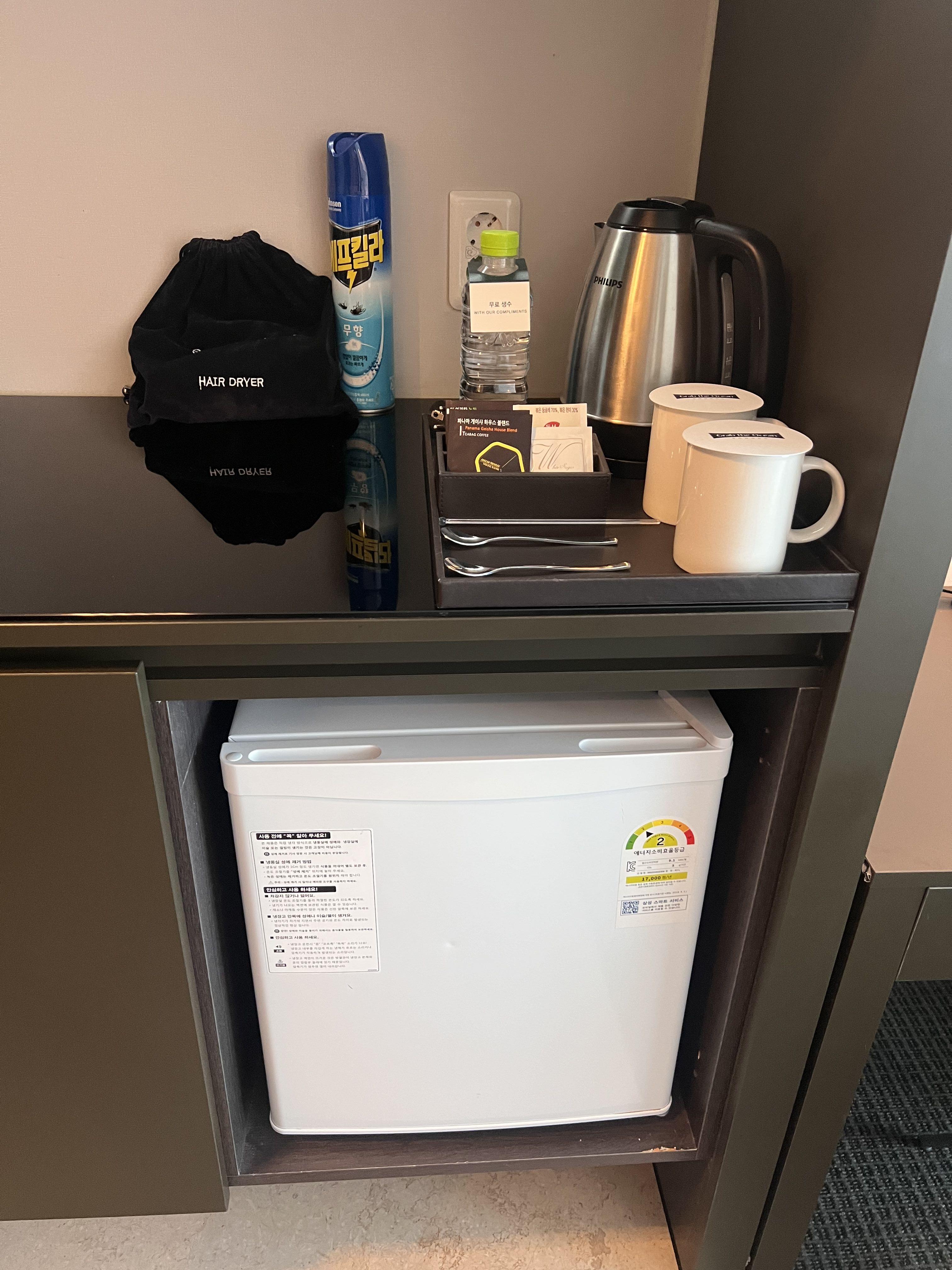 드라이기, 생수, 커피포트, 가운 등 어지간한건 다 구비되어 있고 크진 않지만 냉장고도 있습니다.