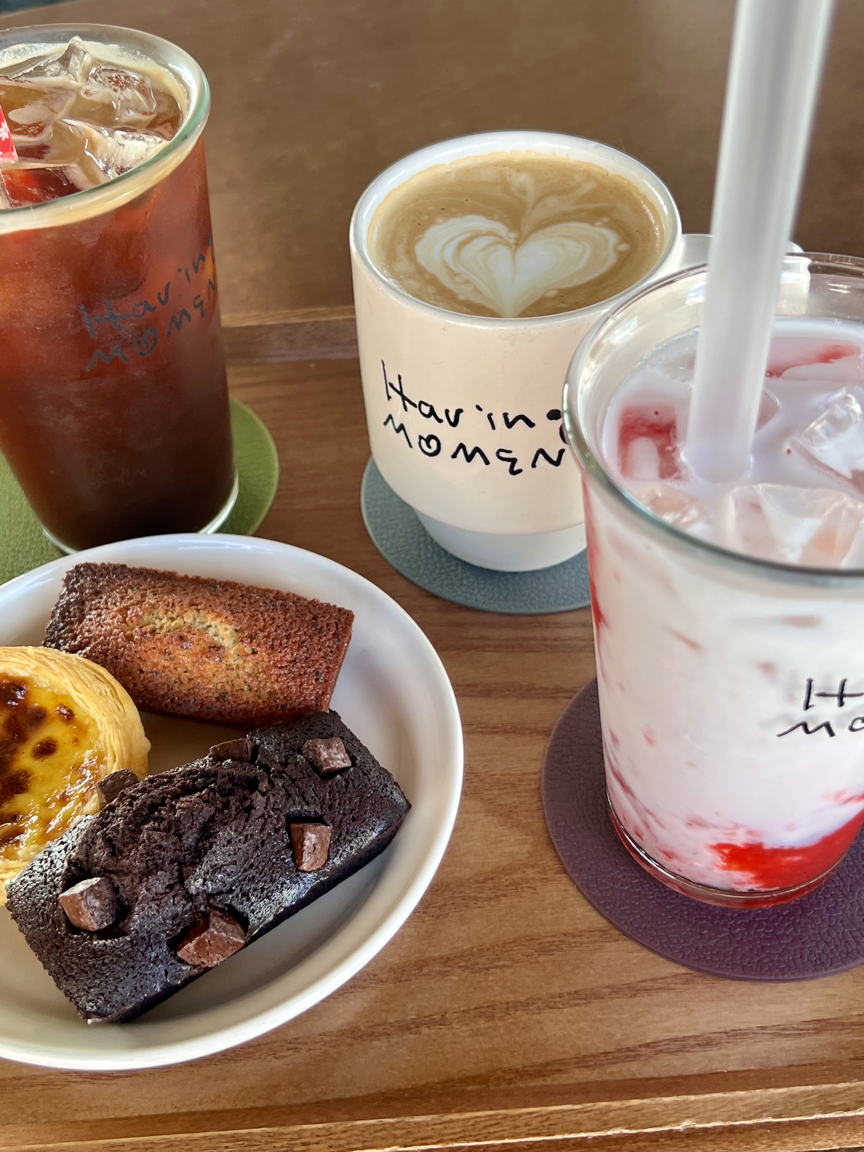 저희는 아이스아메리카노, 딸기라떼, 따뜻한 바닐라 빈 라떼, 에그타르트, 초코 휘낭시에, 얼그레이 휘낭시에를 주문했습니다:)